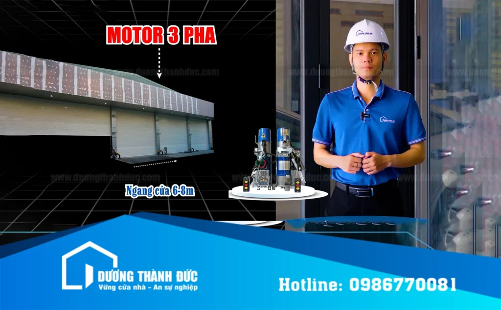 Với cửa có kích thước lớn, tải trọng cao hoặc tần suất hoạt động nhiều, motor 3 pha gần như là lựa chọn bắt buộc để đảm bảo cửa vận hành ổn định và bền bỉ.